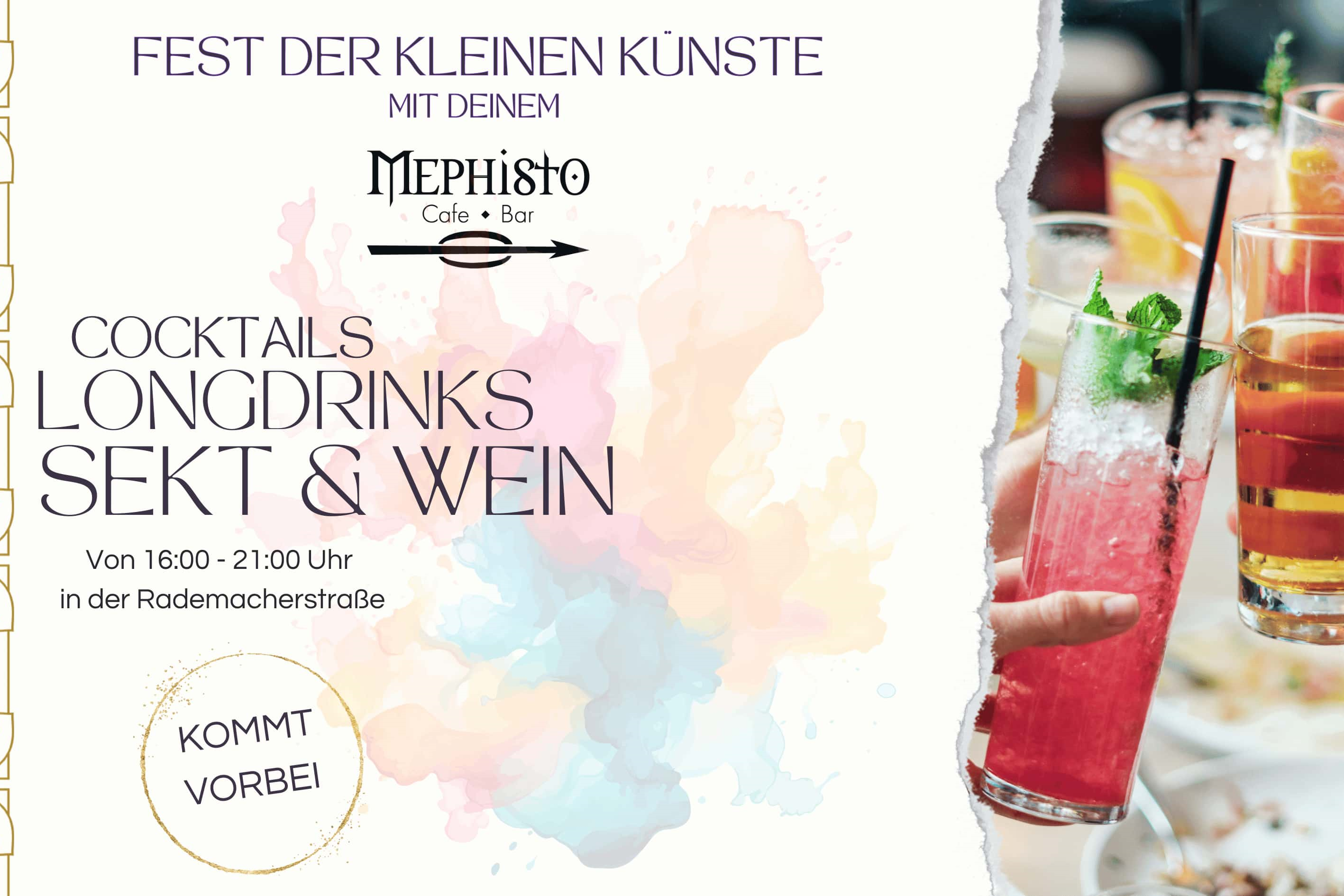 Am 14.09. beim Fest der kleinen Künste vorbeischauen! Genieße Cocktails & mehr am Mephisto-Stand in der Rademacherstraße. Freu dich auf einen unvergesslichen Abend!
