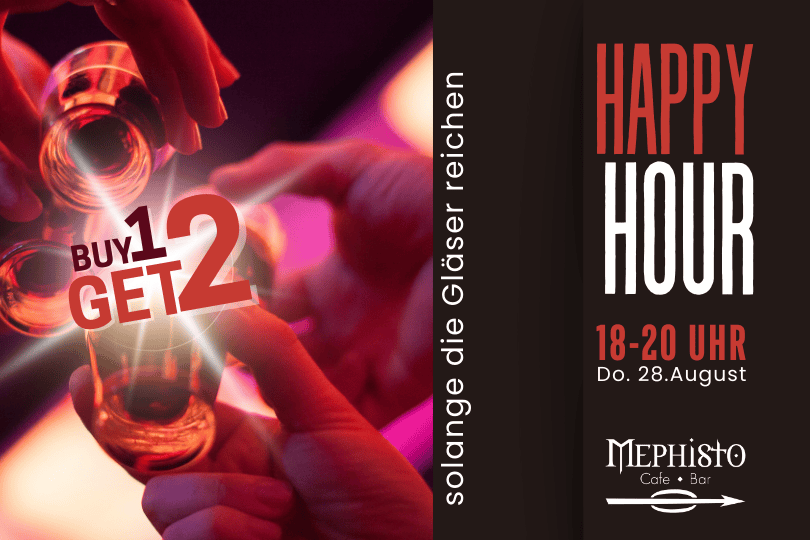 Jeden letzten Donnerstag im Monat heißt es im Mephisto: Ein Drink zahlen – zwei genießen. Perfekt, um entspannt ins Weekend zu starten.